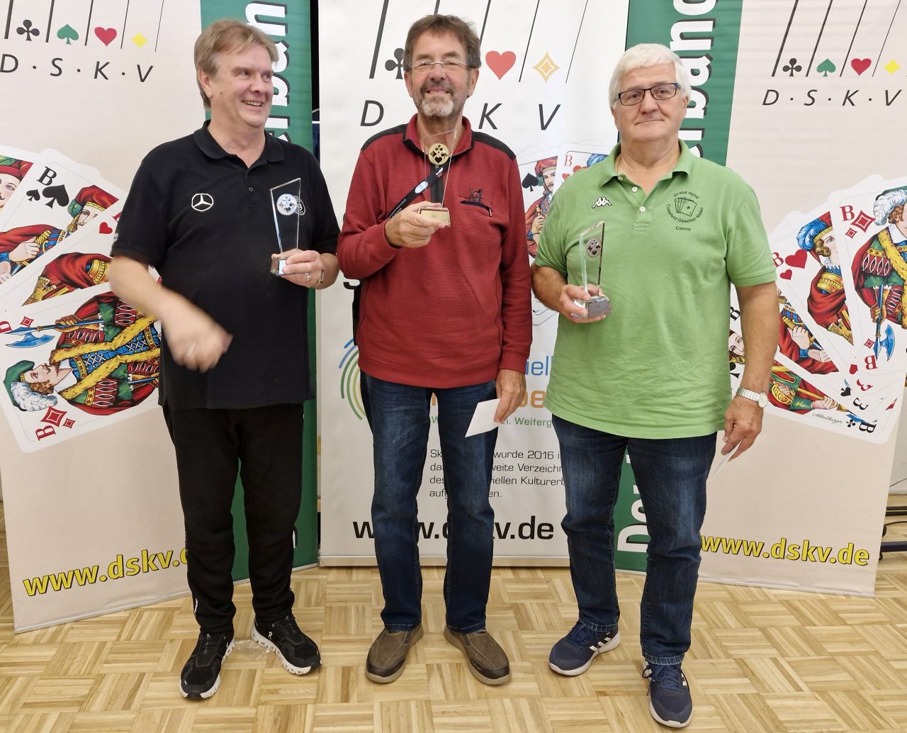 Sieger des 11. Deutschen Senioren Pokal mit 5.628 Pkt. wurde Peter Baake vom Hasseröder Skat Club (mitte) vor Jürgen Hänsler vom SG Stern Sindelfingen mit 5.342 Pkt. (links) und Conny Röhrich vom Grand Hand Coesfeld mit 5.237 Pkt (rechts).
