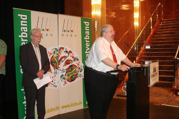 DSkV Präsident Peter Tripmarker und LV 04 Präsident Gerd Ebel begrüßen 298 ! Tandems aus ganz Deutschland, die alle gewinnen wollen. Der Direktor des Maritim Düsseldorf Jens Vogel sprach ebenfalls einige Worte. Dann kam der Wettkampfeid von Bernd Goerke (Vorjahressieger vom LTW Lüdingworth) sowie die Nationalhymne von der Sopranistin Eva Engel.