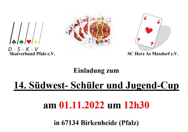 Der Skatverband Pfalz, in Zusammenarbeit mit dem SC Herz As Maxdorf lädt ein zum 14. Südwest Schüler und Jugend Cup am 1. November in Maxdorf.