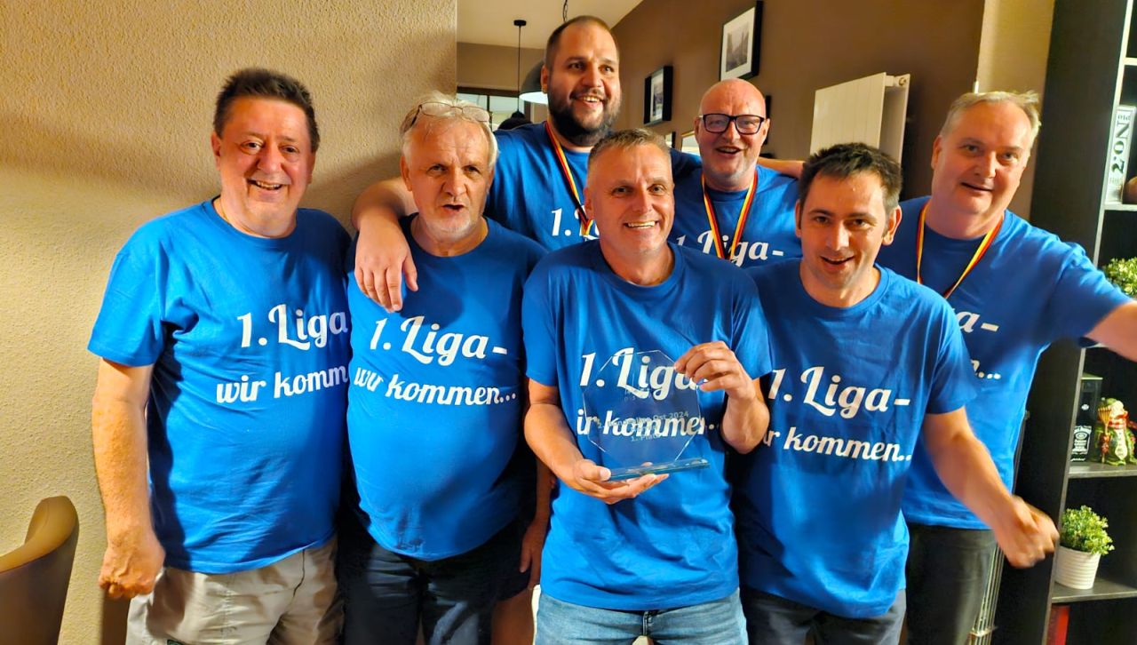 Aufschrift: „Liga eins-Wir kommen!“ Flöha kämpft noch um den Titel. Tagesserie 3 – die letzte der Saison 2024 in der 2.BuLi Ost. Schön war’s über die Jahre. Im Vergleich zum Gesamtstand nach Turnierserie 14, ergab es kaum Änderungen. Aus den Rängen von 9 bis 16, rutschte nur eine Mannschaft nach oben – glücklich hier: Teichdorfer Wölfe. Demzufolge ging eine aus Liga 2 in Liga 3 – unglücklich hier: Dresdner Skatbuben!
