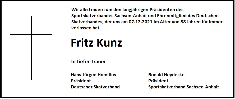 Wir alle trauern um Fritz Kunz, den langjähriger Präsidenten des Sportskatverbandes Sachsen-Anhalt und Ehrenmitglied des Deutschen Skatverbandes, der uns am 07.12.2021 im Alter von 88 Jahren für immer verlassen hat.