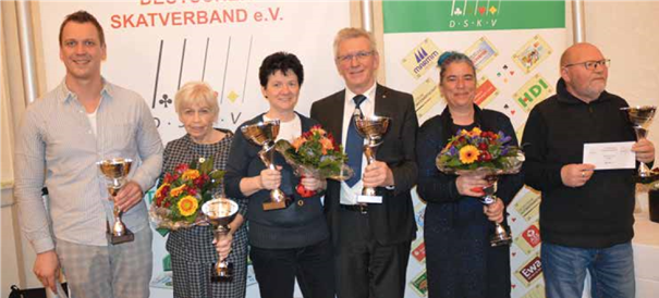 So richtig fassen konnten sie es nicht. Der Präsident des DSkV, Hans-Jürgen Homilius und seine Tandem-Partnerin Petra Grimm gewannen den MixedPokal. Als sich Homilius bei der Siegerehrung die Pokale schnappte, um sie zu verteilen, realisierte er wahrscheinlich erst, als sie ihm aus der Hand genommen wurden, das er sie bekommen sollte. So werden (Skat-) Märchen wahr und sie müssen nicht immer von den Gebrüder Grimm geschrieben werden.