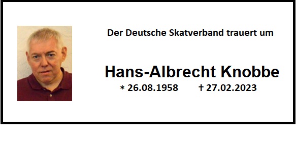 Der Deutsche Skatverband e.V. und der Skatsportverband NRW e.V. trauern um Hans-Albrecht Knobbe, der uns am 27.02.2023 für immer verlassen hat.