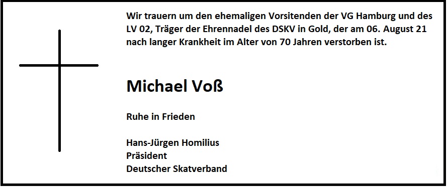 Am 6.August 2021 ist der Gründer des Skatclub Lurup im SV Lurup Michael Voß, nach langer Krankheit verstorben, er wurde nur 70 Jahre alt.  Michael war über 25 Jahre Vorsitzender, er war Ehrenmitglied, ehemaliger Präsident der Verbandsgruppe Hamburg und auch langjähriger Präsident des Landesverbandes. Für sein Engagement und seine Verdienste um den deutschen Einheitsskat  wurde er mit der Ehrennadel in Gold des Deutschen Skatverbandes ausgezeichnet.