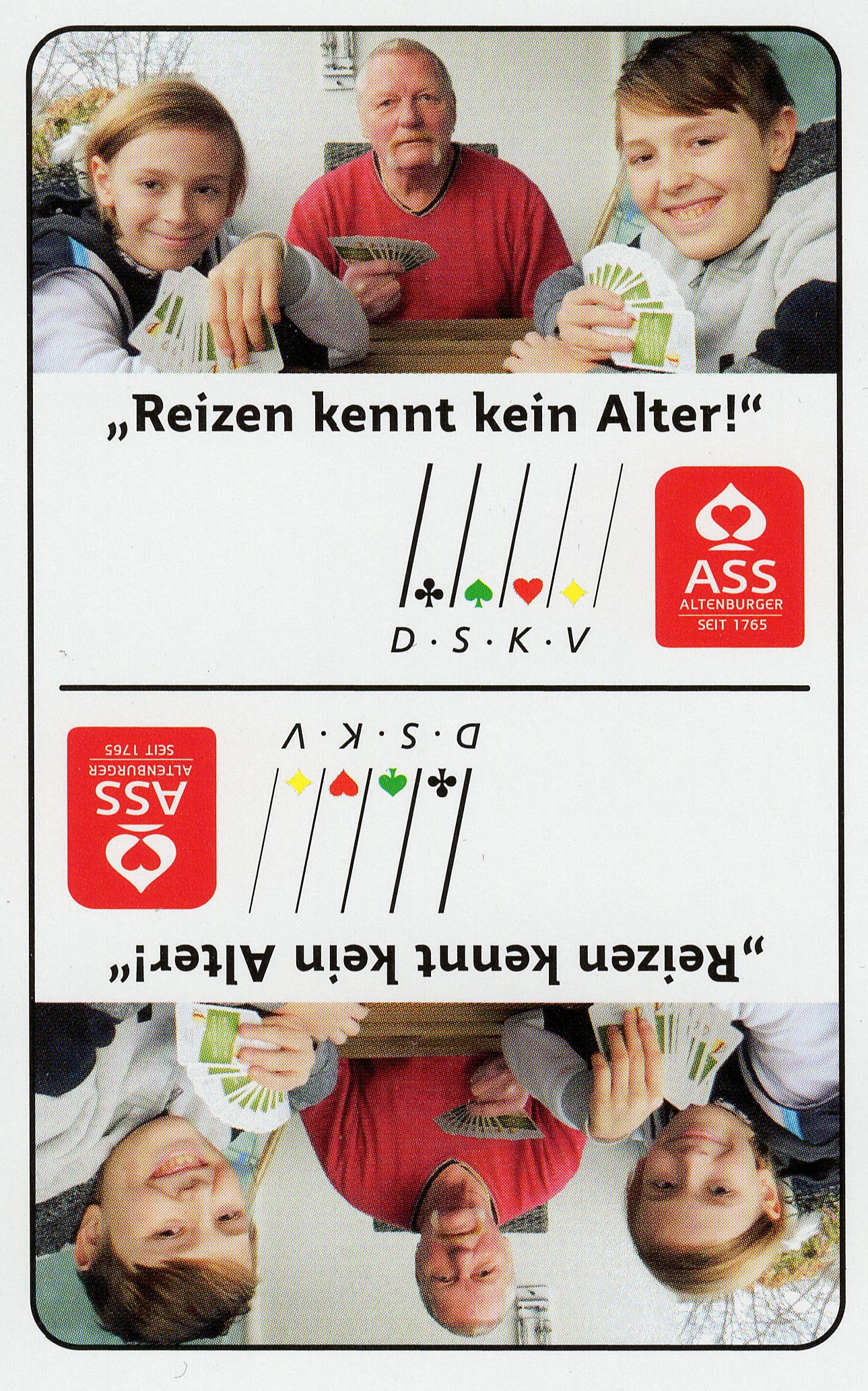 Für die anderen Spiele sollte der Slogan ‚Reizen kennt kein Alter!‘ genutzt werden. Hier war ein generationenübergreifender Spieltisch mit jungen und alten Skatspielern gesucht. Die Berliner Jugendleiterin Elli Kabs stellte ein Foto mit ihren beiden Söhnen Timo und Paul, sowie dem Freund der Familie, dem Skatfreund Karl-Heinz Hörl, zur Verfügung. Ein herzlicher Dank geht hierfür nach Berlin.