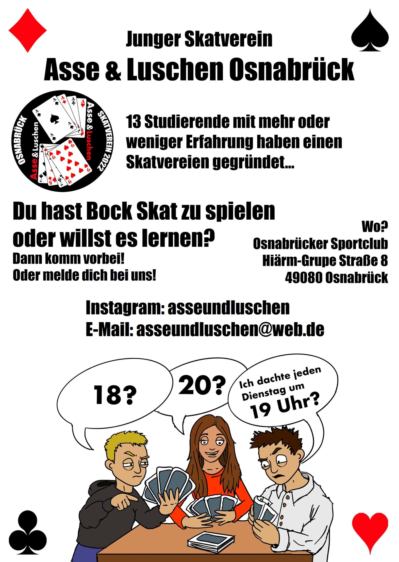 Wir haben in Osnabrück bewiesen, dass Skat noch lange nicht ausgedient hat! Diesen Weg, den wir gegangen sind, kann man an vielen Orten in Deutschland gehen! Ein Mitglied von uns hatte schon scherzhalber gesagt, wenn unsere Studierenden im Verein irgendwann wieder Osnabrück verlassen, gründen sie einfach in der neuen Stadt die „Asse & Luschen XYZ“. Damit das, was wir erreicht haben auch in anderen Städten möglich ist, haben wir die „Initiative Hochschulsport“ ins Leben gerufen.