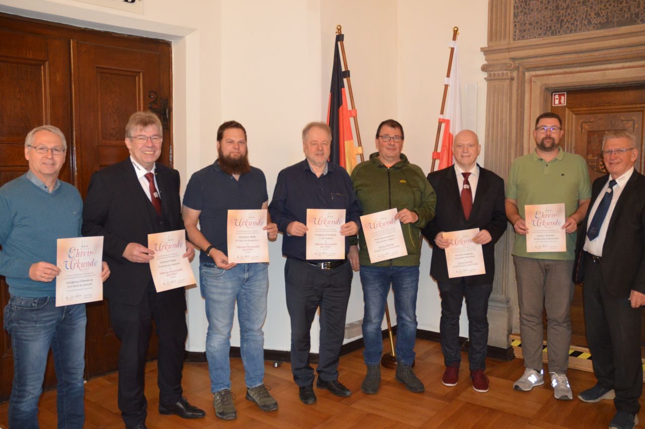 Sieben auf einen Streich: Nach der Begrüßung und Eröffnung des Verbandstages wurden Wolfgang Oldenburg (Ehrenurkunde), Gerfried Meyer (Silberne Ehrennadel), Christian Bode (Silberne Ehrennadel), Wolfgang Wiewesiek (Silberne Ehrennadel), Ralf Zimmermann (Goldene Ehrennadel), Ronald Heydecke (Goldene Ehrennadel) und Sascha Dechert (Ehrenurkunde) vom DSkV-Präsidenten Hans-Jürgen Homilius (v.l.n.r.) geehrt.