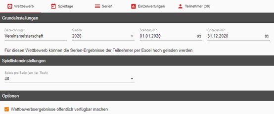 Zuerst wird ausgewählt, in welcher Saison der Wettbewerb stattgefunden hat. Beim Wettbewerbstyp handelts es sich um eine Vereinsmeisterschaft, und bei der Art der Ergebniserfassung wähle „Serien-Ergebnisse importieren“. Klick dann auf „Wettbewerb anlegen“.