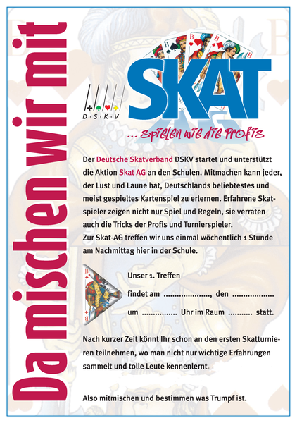 Deshalb werbe ich als DSkV-Jugendreferent um Mitstreiter in der Jugendarbeit. Mir ist klar das bei vielen Skatfreunden eine Hemmschwelle existiert. Sie stellen sich Fragen wie folgende: Wie gehe ich an diese Aufgabe am besten heran? Wen muss ich dazu kontaktieren? Kann ich eine Skat-AG leiten? Benötige ich didaktische Fähigkeiten?