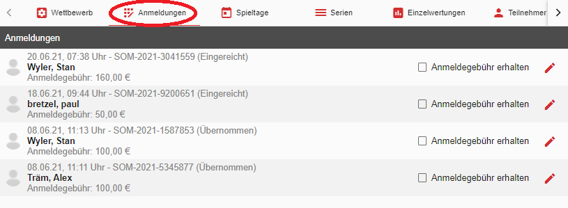 Wenn du nun deinen Wettbewerb bearbeitest, siehst du im Reiter Anmeldungen eine Übersicht, die dem folgenden ähnelt: