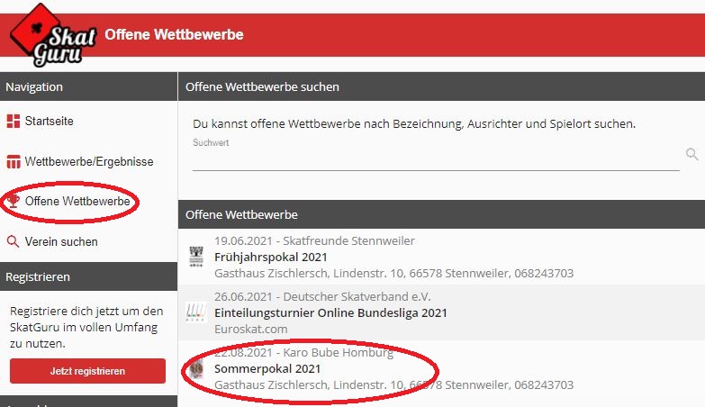 Öffne hierzu https://app.skatguru.de/ und logge dich ein. Im Abschnitt Navigation auf der linken Seite klicke auf Offene Wettbewerbe. Alle Turniere werden in chronologischer Reihenfolge wie folgt angezeigt: