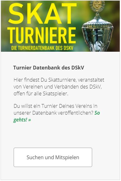 Die Turnierdatenbank des DSkV erreicht Ihr entweder unter Offene Wettbewerbe oder durch Klicken auf den Teaser am unteren Ende der DSkV Webseite.